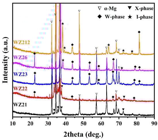 Figure 1 displays the XRD patterns of as-cast Mg–2Y–xZn alloys across varying Zn compositions. Alongside the α-Mg matrix, the predominant second phases detected in the five alloys are identified as X-phase, W-phase, and I-phase, with phase assignments validated via ICDD PDF card 2004. Based on the XRD patterns, the WZ21 alloy primarily contains the X-phase, while the WZ22 alloy comprises both the X- and W-phases due to its higher Zn content. When the Zn content increases to 3 at.%, the WZ23 alloy consists exclusively of the W-phase. When the content of Zn exceeds 3 at.%, the I-phase starts to appear and also contains the W-phase, the two alloys are WZ26 and WZ212 respectively. It is evident that the phase composition in the Mg–2Y–xZn alloy system varies in response to changes in the Zn content. When the content of Zn increases, the second phase is more inclined towards the second phase with a larger Zn/Y ratio. Therefore, the predominant second phases in Mg–2Y–xZn alloys systematically transition between X-phase, W-phase, and I-phase with progressive Zn content variation.