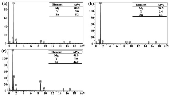 The dominant second phases were analyzed by EDS (Figure 3), with subfigures (a)–(c) corresponding to points A, B, and C marked in Figure 2, respectively. The ratios of Y/Zn in the gray lath-shaped, reticular-shaped, and block-shaped secondary phases are approximately 1:1, 2:3, and 1:6, respectively, as indicated by the results. The analysis of the XRD findings (Figure 1) combined with the microstructural features (Figure 2) enables the identification of these phases. The lath-shaped microstructure is identified as the X-phase, while the reticular eutectic structure corresponds to the W-phase, and the bulk morphology is attributed to the I-phase. Additionally, the formation of the W-phase is promoted when the Zn content is increased up to 3 at.%. The I-phase starts to form at 6 at.% Zn content and its formation increases progressively with further increases in Zn content. In the alloy series, the X-phase is preferentially generated for the WZ21 alloy because the ratio of Zn/Y is 1. Additionally, the tiny white particles are identified as Mg24Y5 and their generation is attributed to Y elemental segregation in the process of microstructure formation. Stanford et al. [25] have studied the grain boundary segregation of rare-earth elements in magnesium alloys. Combined with the SEM image, we can observe that the white particles are mostly produced at the grain boundaries. As for the WZ23 alloy, the W-phase is exclusively observed at a Zn content of 3 at.%. In contrast, the WZ22 system exhibits dual-phase characteristics (X-phase and W-phase) within the 1–3 at.% Zn compositional range. Progressive Zn additions (6–12 at.%) elevate the Zn/Y atomic ratio beyond 1.5, inducing preferential formation of zinc-enriched intermetallic compounds (I-phase) during solidification. This phase evolution mechanism corroborates findings reported in analogous Mg–RE–Zn ternary systems by Lee et al. [26] and Zhu et al. [27].