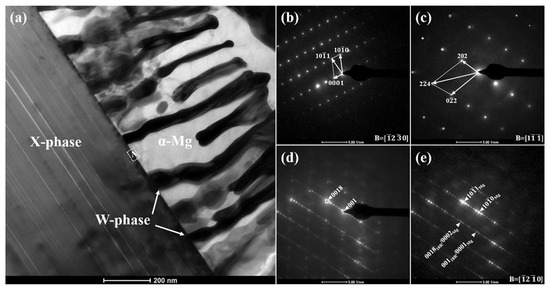 Microstructural characterization of WZ22 alloy: (a) TEM image showing phase distribution and interfacial regions; (b–d) SAED patterns corresponding to (b) α-Mg matrix, (c) W-phase, and (d) X-phase, indexed along the zone axes B = [230] and B = [1], respectively; (e) Composite diffraction pattern acquired from the α-Mg/X-phase interface (marked as region A in (a)), demonstrating crystallographic orientation relationships between the two phases.