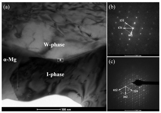 TEM characterization of WZ26 alloy: (a) Bright-field image showing characteristic microstructure; (b) SAED pattern indexing to the W-phase, (c) composite diffraction from zone B (marked in (a)) revealing W-phase/I-phase interface relationships.