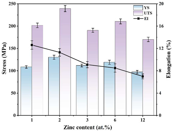 - As Zn content increases, UTS and YS exhibit a dual-peak trend: initially rising from 1 to 2 at.% Zn, declining at 3 at.% Zn, rebounding at 6 at.% Zn, and finally decreasing at 12 at.% Zn. Peak strength occurs in Mg–2Y–2Zn (UTS: 239 MPa, YS: 130 MPa), while Mg–2Y–1Zn achieves the highest elongation (12.62%).