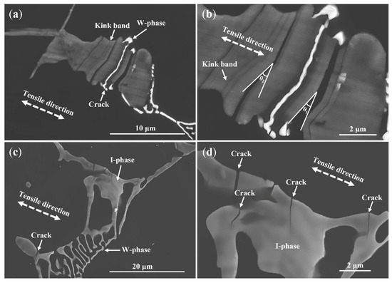 Intriguingly, the W-phase embedded within the X-phase remained intact with minimal deformation (Figure 7a,b), suggesting its role in impeding X-phase kinking. Quantitative analysis revealed distinct kink angles in regions adjacent to the W-phase (θ1 = 20°) compared to regions without W-phase obstruction (θ2 = 23°). The ~15% increase in θ2 underscores the pronounced inhibitory effect of the W-phase on X-phase deformation, confirming a synergistic strengthening mechanism between the two phases. In contrast, the W-phase within the Mg matrix of WZ22 fractured extensively (Figure 7a), generating microcracks that propagated during deformation, ultimately leading to alloy failure. This disparity arises from the inherent hard-brittle nature of the W-phase, which exacerbates crack initiation in the Mg matrix but enhances load transfer efficiency when embedded within the X-phase.
