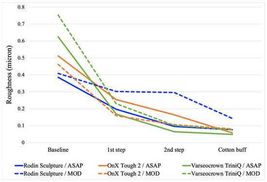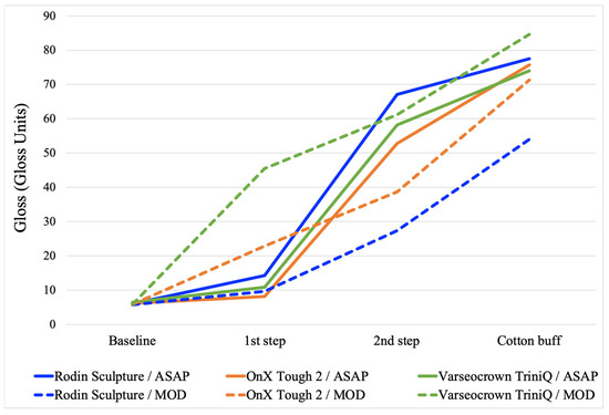 Observation of Figure 2 and Figure 3 reveals information regarding the efficacy of the different steps of the polishing systems. The first step of the ASAP system had a large effect on reducing roughness but did not affect gloss considerably. The second step of the ASAP system was responsible for producing a large improvement in gloss. This performance was expected, as the first step of the polishing system was labeled as a pre-polisher and contains large (30 µm) diamond abrasives, whereas the second step was labeled as the high-shine polisher and contains smaller (4 µm) diamond abrasives. For the MOD system, the first step (the bristle brush and polishing paste) was only effective in improving gloss and roughness for the less-filled materials, OnX Tough 2 and VarseoSmile TriniQ. The cerium oxide abrasive in the polishing paste may have not been as effective as the diamonds in the ASAP system with the highly filled Rodin Sculpture material.