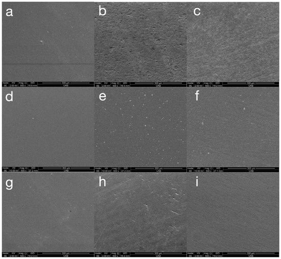 Representative (n = 1) SEM images (original magnification of 500×) of toothbrushed materials Rodin Sculpture (a–c), OnX Tough 2 (d–f), and VarseoSmile TriniQ (g–i) with different surface treatments of varnish (a,d,g), ASAP (b,e,h), and MOD (c,f,i).