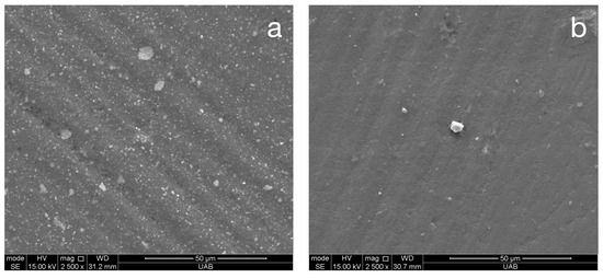 Representative (n = 2) high-magnification SEM images (original magnification of 2500×) of scratches created by toothbrushing from a representative specimen of Rodin Sculpture (a) and VarseoSmile TriniQ (b).