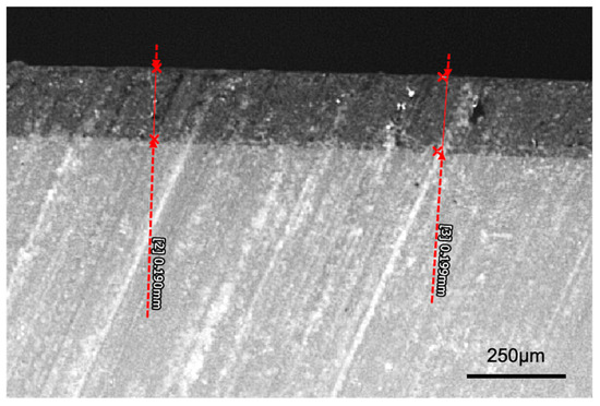 A cross-sectional light micrograph of the varnish layer is presented in Figure 7. This image demonstrates that the varnish layer was approximately 200 µm. The thickness of the varnish was slightly thinner at the edges of the specimens.