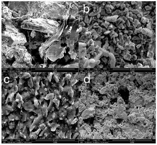 Representative (n = 1) SEM images (original magnification of 5000×) of different polishers: ASAP pre-polish (a), ASAP high-shine (b), rubber acrylic polisher (c), and diamond abrasive paste (d).