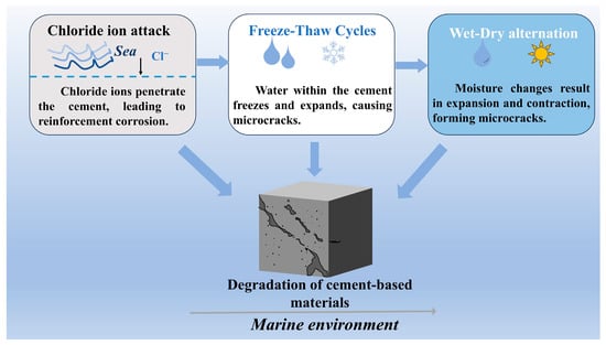 To better illustrate the degradation mechanisms of cementitious materials in marine environments, we have included a diagram that visualizes the key environmental factors contributing to the deterioration process. As shown in Figure 1, chloride ion attack, freeze–thaw cycles, and wet–dry alternation play critical roles in the degradation of cement-based materials, leading to structural deterioration. This diagram helps to clarify the challenges faced by cementitious materials exposed to harsh marine conditions and provides context for the subsequent experimental results.