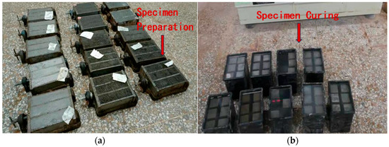 Preparation of cement mortar specimens: (a) preparation of cement mortar specimens; and (b) curing of cement mortar specimens.