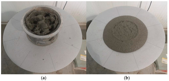 As one of the key indicators of workability for both ordinary and composite cement mortars, flowability was evaluated in this study following the GB/T 2419-2005 [23]. A cement mortar flow table (commonly known as a “flow table”) was used to measure the flowability, as illustrated in Figure 3a,b. According to GB/T 2419-2005, the standard design value for the flowability of cement mortar is 180 mm. For cement mortar incorporating superplasticizers or composite cement mortar, the target flowability is adjusted to ensure proper molding without bleeding or insufficient cohesion, generally ranging between 150 and 180 mm.