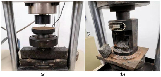 According to the provisions of GB/T 17671-2021, the mechanical properties of the flexural and compressive strength for the prepared composite cement mortar specimens were tested using a YAW-3000 testing machine with Grade I accuracy (Xinguang Testing Instrument Co., Ltd., Cangzhou, China), as shown in Figure 4a,b. The specimen dimensions are 40 mm × 40 mm × 160 mm. For each group, 3 flexural strength values and 6 compressive strength values were obtained. During data processing, if any flexural or compressive strength value exceeded the average by more than ±10%, it was excluded and the average was recalculated. For compressive strength, if, after exclusion, any of the remaining 5 values deviated from the average by more than ±10%, they were considered invalid data.