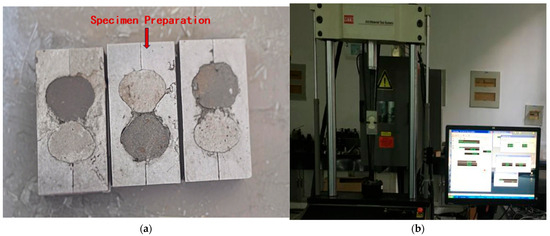According to the requirements specified in the JTS/T 232-2019 [24] and the JTS/T 311-2023 [25], the tensile strength of the repair mortar was determined. Three ‘8’-shaped specimens were prepared per group, as shown in Figure 5a. The specimens were demolded after 24 h of casting and then cured in a constant temperature and humidity chamber at 20 ± 2 °C and 65 ± 5% relative humidity for up to 14 days. Tensile strength was measured using an MTS-810 material dynamic testing system (MTS Systems Corporation, Eden Prairie, MN, USA), as shown in Figure 5b. The tensile strength was calculated according to Equation (1) and the average of three measurements was taken as the final result: