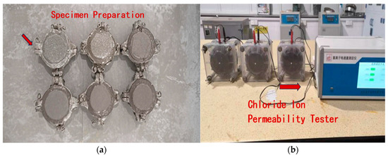 In accordance with the (JGJ/T 193-2009) [27], the electrical flux method was employed for the study. Cylindrical specimens with a height of 50 mm and a diameter of 100 mm were prepared, as shown in Figure 8a, with an error margin controlled within ±1 mm. The test measures the charge passed over a specific period to characterize the ability of concrete to resist chloride ion penetration. The electrical flux of composite cementitious mortar specimens, cured for the required age, was measured. The average value of three specimens per group was taken as the electrical flux value. The test setup is shown in Figure 9b.