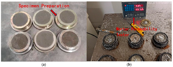 The permeability performance of the specimens was evaluated according to the specifications in JTS/T 236-2019. The conical mold used for the permeability test has a height of 30 mm, with the upper and lower diameters being 70 mm and 80 mm, respectively. The test molds were placed on the vibration table for compaction and the surface was leveled to form the specimens. The equipment used for the test was a mortar permeability tester. For each mix of cementitious mortar, six specimens were prepared per group, as shown in Figure 10a. After molding, the specimens were left to stand at room temperature (20 ± 5 °C) for 24 ± 2 h before demolding and then cured until the specified age. The specimens were subsequently subjected to permeability testing. According to the standard procedure, water pressure was applied; the test was terminated when surface seepage was observed in three out of six specimens. When the water pressure was held constant, the permeability performance was evaluated based on the maximum pressure at which at least four out of six specimens remained free of seepage, as illustrated in Figure 10b.