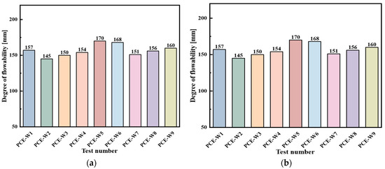 Flowability of composite cementitious mortar for Scheme 3 and Scheme 4: (a) Scheme 3; and (b) Scheme 4.