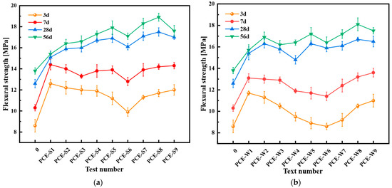 The flowability of composite cement mortars containing two types of polycarboxylate superplasticizers, PCE-S and PCE-W, was analyzed under varying types and dosages of mineral admixtures. Among these, PCE-S1 and PCE-W1 served as control specimens without any mineral admixture. The comparative results of all mix designs are presented in Figure 11.