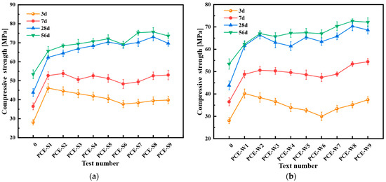 As shown in Figure 23a, for the 0 mix design, the main hydration products at early curing ages are CH and several unhydrated cement minerals, such as C3S and C2S, along with a small amount of ettringite (AFt). As hydration progresses, the diffraction peaks corresponding to the cement minerals gradually decrease. However, even after 28 days, small amounts of unhydrated minerals remain, while the diffraction peaks of CH and other hydration products tend to stabilize, exhibiting minimal changes in intensity. As shown in Figure 23b, in the PCE-S1 mix design, the cement mineral phases C3A and C4AF begin to hydrate, while the relatively abundant C3S also accelerates its hydration reaction. During this process, the hydration of C3S generates CH crystals and C–S–H gel, while the hydration product of C3A is calcium aluminate hydrate (CAH) crystals. This indicates that the addition of polycarboxylate-based high-performance superplasticizer can enhance the early hydration rate of cement, improving its early strength. Furthermore, in the later stages of hydration, components such as C3S and C3A continue to hydrate, generating more hydration products, like CH and CAH, which contribute to improving the mechanical properties.