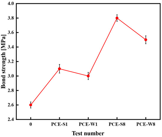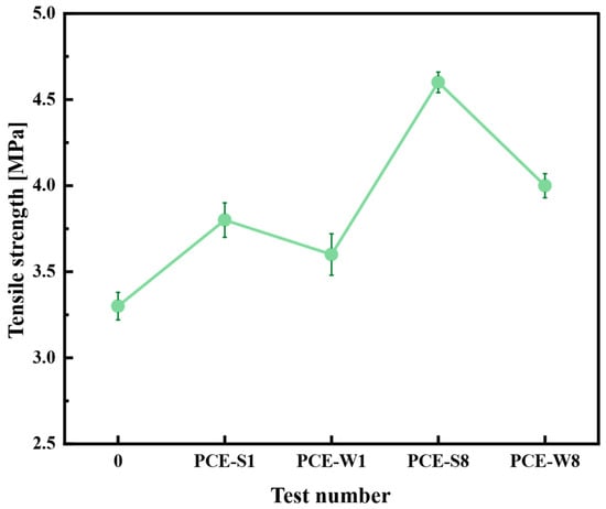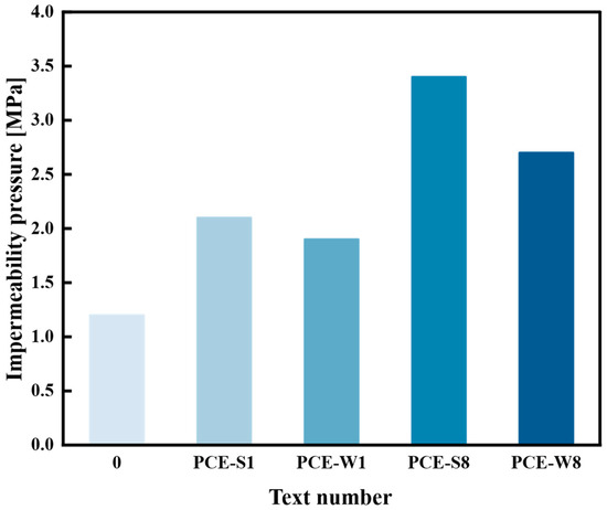 The permeability test was conducted on four composite cementitious mortars, namely PCE-S1, PCE-W1, PCE-S8, and PCE-W8. The initial water pressure was set to 0.2 MPa; the maximum water pressure was set to 4.2 MPa. During the test, the permeability device automatically increased the water pressure by 0.1 MPa every hour. Throughout the test, the water pressure was observed and recorded every 0.5 h. The calculation followed Equation (2). The test used specimen No. 0 as the control and the maximum water penetration pressure values for all five groups, including the control, were obtained. The results are shown in Figure 22.