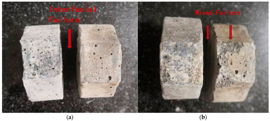 “8”-shaped specimens were prepared, following the tensile test requirements. During molding, a metal plate was inserted at the center. After demolding, the two halves were separated and cured for 28 days. Half of the specimens were then placed back into the “8”-shaped mold, and an interface bonding agent was applied to the fracture surface. Freshly mixed repair mortar was poured into the blank half of the mold to remold and form new-to-old cement mortar bonding specimens. The bonded specimens were cured under the same conditions for 28 days. The bond tensile strength was then measured using the MTS-810 material testing system. The average of three measurements was taken as the final result, as shown in Figure 6a,b. Bond strength was calculated according to Equation (1) and was required to be no less than the tensile strength standard of the original concrete structure.