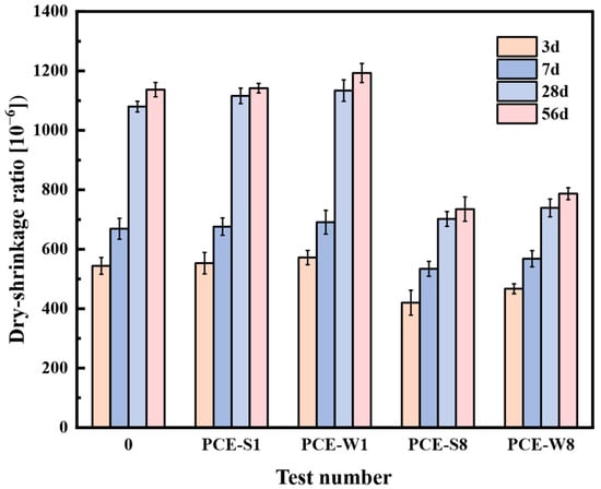 According to the requirements of JTS/T 232-2019 and JTS/T 311-2023, mortar specimens were prepared using molds measuring 40 mm × 40 mm × 160 mm. Each mold features a hemispherical groove with a radius of 2.5 mm at the center of both end forms. Three specimens were prepared per group, as shown in Figure 7a. The molding process was carried out in two layers, with 10 fillings and roddings per layer. After molding, the specimens were placed in a curing box at 20 ± 2 °C with a relative humidity of no less than 80%. After 48 h, the molds were removed and the specimens are then placed in water at 20 ± 2 °C for an additional 5 days of water curing. Afterward, the specimens are removed, dried, and their reference length was measured using a vertical shrinkage device, as shown in Figure 7b. The specimens were then placed in a curing chamber at 20 ± 2 °C and a relative humidity of 65 ± 5% until the designated curing age, after which their lengths were measured. Dry shrinkage was calculated according to Equation (2), with an accuracy of 1 × 10−6. The average value of three specimens per group was taken as the dry shrinkage rate at the corresponding curing age, as follows: