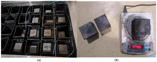 The frost resistance performance of the specimens was evaluated in accordance with the JTS/T 236-2019 [26]. Cube specimens with dimensions of 70.7 mm × 70.7 mm × 70.7 mm were used. Two sets of specimens were prepared for each mix composition: one set (three specimens) was reserved as a control group for compressive strength measurement, as shown in Figure 8a. The HC-HDK9/Y rapid freeze–thaw testing machine (Hangzhou Guanli Intelligent Technology Co., Ltd., Hangzhou, China). was used to perform the test, as shown in Figure 8b. Specimens that had reached the designated curing age were removed from the curing chamber for visual inspection. The freeze–thaw medium was seawater. Before testing, the specimens were air-dried for two days and then immersed in seawater for another two days. During the freeze–thaw cycling process, the freezing duration should be approximately 4 h, and the thawing time in water should not be less than 4 h. The temperature ranges for freezing and thawing are −20 °C to −15 °C and 15 °C to 20 °C, respectively. The ambient laboratory temperature during the test should be maintained at 20 ± 2 °C.