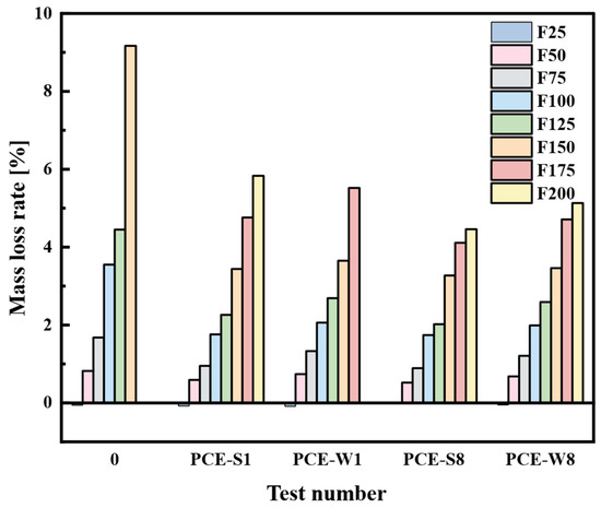 From Figure 19, it can be seen that after 25 freeze–thaw cycles (F25), the mass of all five groups of cement mortar specimens increased. This phenomenon may be attributed to the freeze–thaw-induced expansion pressure, which generates microcracks and enlarges existing capillary pores. As a result, the internal porosity increases, allowing for more water to be retained within the matrix during the thawing stage, thereby leading to a net gain in mass. After F50, the mass of all five groups of composite cement mortar specimens decreased. As the number of freeze–thaw cycles increased, different degrees of spalling or damage appeared on the specimen surfaces, with some specimens even fracturing. The control specimen (0) showed a mass loss of 9.17% at F150, exceeding the standard performance requirement of 5%, and was much higher than the mass loss observed in the PCE-S1 and PCE-W1 cement mortar specimens with superplasticizers under the same number of freeze–thaw cycles. This is because superplasticizers have an air-entraining effect, which significantly enhances the freeze–thaw resistance by improving the internal microstructure of the cement-based material. Compared with PCE-S1 and PCE-W1, the mass loss rates of PCE-S8 and PCE-W8 composite cement mortars are lower, and the effect on enhancing freeze–thaw resistance becomes significantly more pronounced after F175. At F175, PCE-W8 shows a 1.35% reduction in mass loss rate compared to PCE-W1; at F200, PCE-S8 shows a 1.37% reduction in the mass loss rate compared to PCE-S1. This indicates that the incorporation of a larger amount of mineral admixtures is effective in reducing mass loss during freeze–thaw cycles, with the effect becoming more significant as the number of cycles increases.