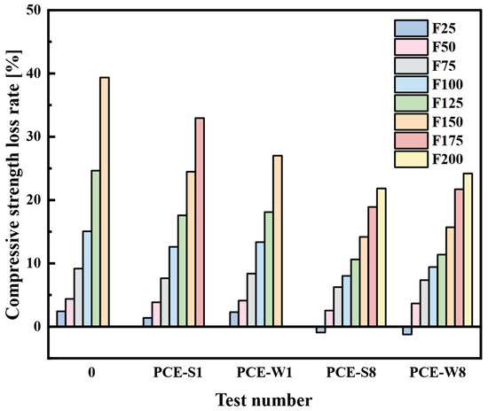 From Figure 20, it can be seen that at F25, the compressive strength of PCE-S8 and PCE-W8 composite cementitious mortars both show an increasing trend, indicating that the cementitious mortars with a larger amount of mineral admixtures continue to undergo further hydration reactions after 28 days of curing, thereby increasing the mechanical strength. After F50, the strength of all five groups of specimens shows a decreasing trend. The decrease in strength of the blank specimen (Test No. 0) is significantly larger than the other mix designs. At F125, the compressive strength loss rate of the blank specimen reached 24.64%, which is close to the 25% limit specified in the performance standards. At F150, the strength decreased by 39.36%, which exceeds the limit by approximately 14.4%. The strength loss rates of PCE-S1 and PCE-W1 cement mortar are lower than that of the blank specimen (Test No. 0) at all freeze–thaw cycles. This is due to the air-entraining effect of the superplasticizer, which improves the internal micro-porous structure, thereby reducing strength loss. At F150, the strength loss rate of PCE-W1 exceeds 25%, while the strength loss rate of PCE-S1 is 24.47%. By F175, the strength loss rate of PCE-S1 reaches 32.95%. The improvement effect of the solid superplasticizer is superior to that of the liquid superplasticizer. Compared to PCE-S1 and PCE-W1 cement mortars, PCE-S8 and PCE-W8 exhibit significantly lower compressive strength loss. At F200, the strength loss rates of PCE-S8 and PCE-W8 are 21.83% and 24.20%, respectively, both of which do not exceed the freeze–thaw performance standard requirements. This indicates that mineral admixtures play an active role in improving the micro-porous structure of cement-based materials, which helps reduce mechanical strength loss. The incorporation of both water-reducing agents and mineral admixtures has a positive effect on improving the freeze–thaw resistance of cement mortars. The PCE-S8, with the combined addition of solid water-reducing agents and a relatively large amount of mineral admixtures, shows the best freeze–thaw performance, meeting the requirement of no fewer than 200 cycles in freeze–thaw tests under marine environmental conditions.