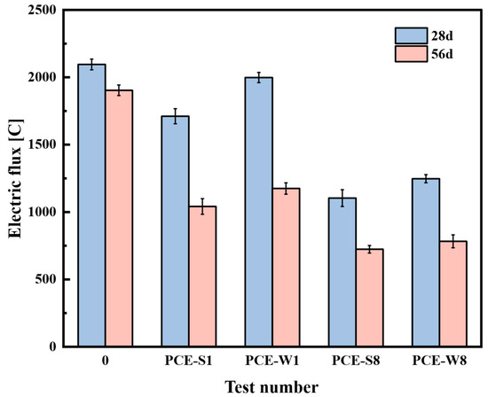 According to the specifications of JGJ/T 193-2009, the electric flux of composite cementitious mortars—PCE-S1, PCE-W1, PCE-S8, and PCE-W8—was measured at curing ages of 28 and 56 days, using the blank specimen (Test No. 0) as the control group to evaluate chloride ion permeability resistance. The current at both ends of each specimen was recorded every 30 min, and the total electric flux over a 6 h period was calculated. The average value of three specimens from each group was used to characterize the chloride ion penetration resistance. The test results are presented in Figure 21.