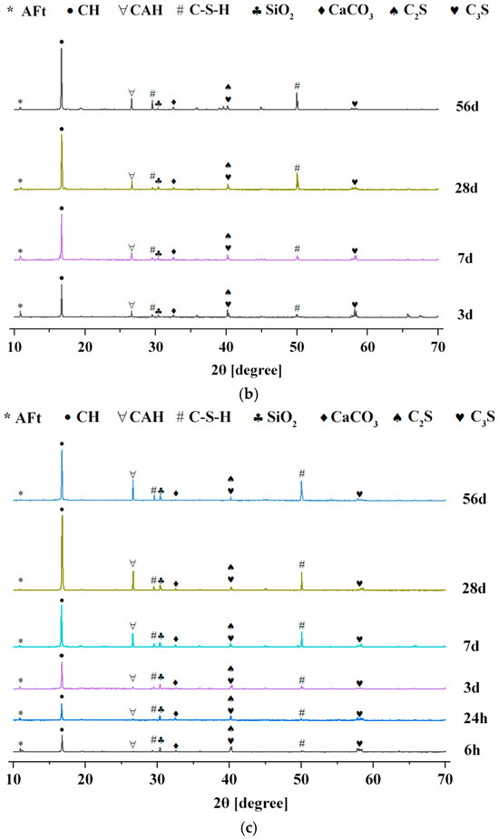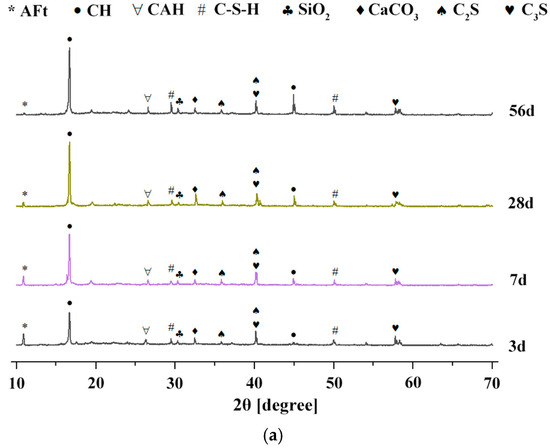 At 56 days, the CH content shows a decreasing trend, while the other hydration products increase. During the early hydration process, the rate at which mineral admixtures consume CH is lower than the rate at which CH is generated by cement hydration. Around 28 days, the consumption rate and generation rate are approximately balanced, and the CH content remains relatively stable. As the curing period continues, the consumption rate of CH gradually exceeds the generation rate, leading to a decrease in CH content at 56 days. After the incorporation of mineral admixtures, such as fly ash and silica fume, the composite cementitious materials contain a certain amount of silicon dioxide (SiO2). As a result, the X-ray diffraction patterns show a diffraction peak for SiO2, with a stronger intensity compared to the patterns of mixtures without mineral admixtures. As seen in Figure 23c, the peak intensity of C–S–H in the early hydration phase changes only slightly with age. This is primarily because the reactivity of mineral admixtures is not fully activated in the early stages and their hydration degree and rate are relatively low.