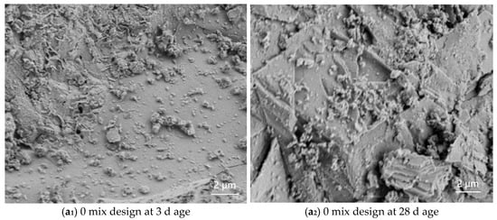 The experiment used a Zeiss Sigma-500 field emission scanning electron microscope (SEM, Carl Zeiss AG, Oberkochen, Germany) to observe the microstructure of four different mix designs of composite cementitious pastes at 3 d and 28 d curing ages, as shown in Figure 24. The images were magnified 10,000 times, with a scanning voltage of 2 kV and a working distance of 6.0 mm.