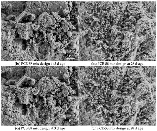 In Figure 24(c1,c2), it can be seen that the PCE-S8 mix shows little reaction at 3 days; however, at 28 days, a distinct gel-like flocculent structure is formed. This indicates that the hydration products of the mineral admixtures are similar to those of Portland cement, with both generating C–S–H gel, with differences in the contents of Ca, Si, Al, and other elements within the gel. Additionally, the calcium aluminate further hydrates, primarily forming plate-like crystalline hydration products of CAH, with a small portion transforming into plate-like hydrated calcium sulfoaluminate (AFm). This reaction occurs rapidly, forming a loose network structure that facilitates the rapid setting of the cement paste.