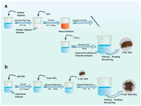 - In total, 10 g of sodium alginate powder was dissolved in 500 mL of deionized water under ultrasonic agitation for 4 h to obtain a bubble-free solution. Then, 50 g of red mud was added and stirred thoroughly, followed by 2 h of ultrasonication to yield a sodium alginate–red mud suspension.