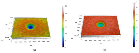 The results of solid particle erosion tests are shown in Figure 13. In both tests, AISI 304 showed the highest mass loss. The results obtained for the studied HEA showed that each HEA revealed a smaller mass loss compared to AISI 304. Moreover, an increase in Ti content caused a decrease in mass loss. Furthermore, the values obtained for tests performed under 30° are higher than for 90° for each studied material. Figure 14 and Figure 15 show the images of the craters formed after erosion tests on the studied materials obtained by laser profilometry. Craters formed after the solid particle erosion test performed under 30° are larger in size and elongated, and they form a shape similar to an ellipse (Figure 14a–e). The craters formed after the erosion test at 90° are round (Figure 15a–e). In both cases, the craters are similar in shape; however, the depth of the craters becomes smaller starting from the crater on AISI 304 (Figure 14a and Figure 15a), for which the depths of the craters are the biggest, ending on Ref.+0.5Ti, for which the depths of the craters are the smallest one (Figure 14e and Figure 15e).