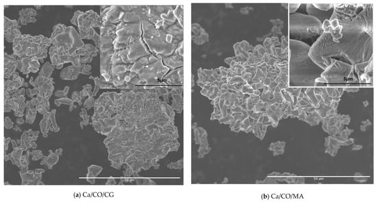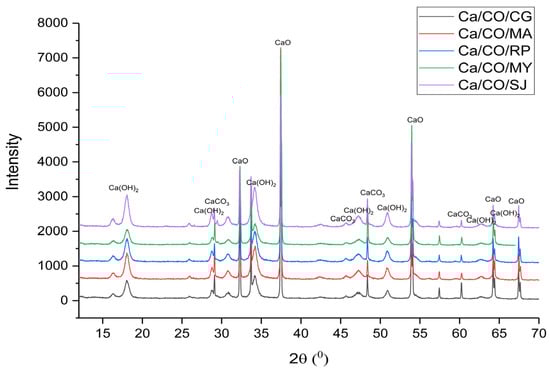 For the Ca/CO/CG sample, the XRD pattern revealed dominant peaks associated with lime (32.35°, 37.44°, 54.00°, 64.37°, and 67.33°), with additional signals from calcite (28.74°, 47.3°, and 60.32°) and portlandite (18.11°, 34.32°, 47.36°, 51.02°, 62.87°, and 64.49°). Similarly, the Ca/CO/MA, Ca/CO/RP, Ca/CO/MY, and Ca/CO/SJ samples displayed clear evidence of CaO as the primary crystalline phase, complemented by varying degrees of calcite and portlandite presence.
