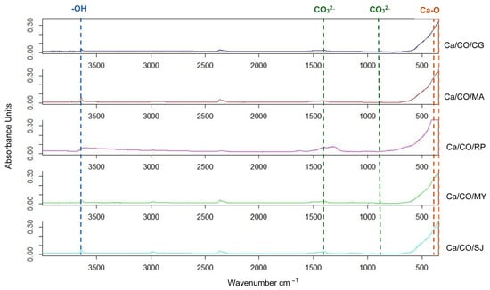 In this study, the FTIR spectra of calcium-based materials obtained after calcination at 900 °C for 2 h were analyzed. The spectra were recorded in the range of 4000–350 cm−1, covering the main absorption regions relevant for the identification of the chemical composition of the samples, as presented in Figure 2.