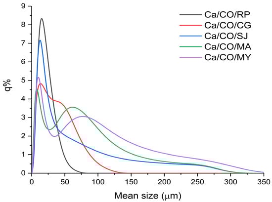 In this analysis, the five samples of shells calcined at 900 °C for 2 h were investigated. The mean size is presented in Table 7. The graph in Figure 3 shows the percentage frequency (q%) of particles for each size class.