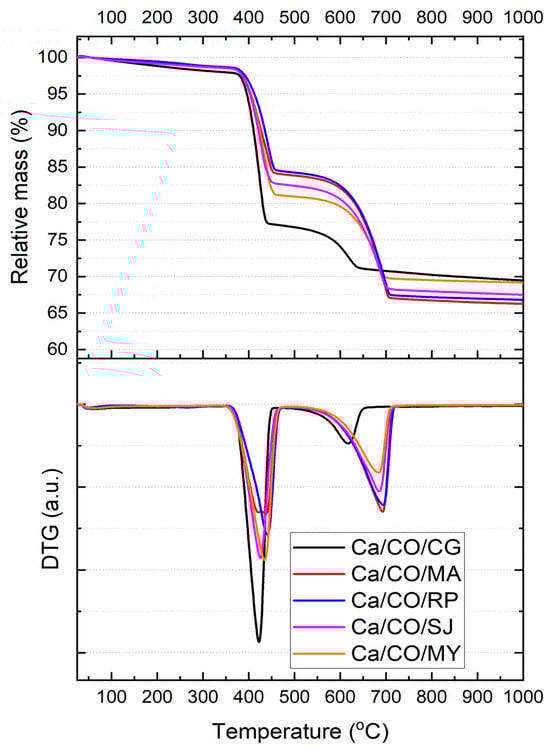 The thermal decomposition profiles indicate species-dependent behavior in terms of reaction kinetics and conversion efficiency. While all samples achieve significant decarbonation upon heating to 1000 °C, the extent and rate of transformation vary, with Ca/CO/MA and Ca/CO/RP exhibiting more gradual but complete two-step decomposition, and Ca/CO/CG showing a sharp initial degradation followed by limited secondary transformation. These findings highlight the influence of biogenic origin on thermal reactivity and final oxide yield.