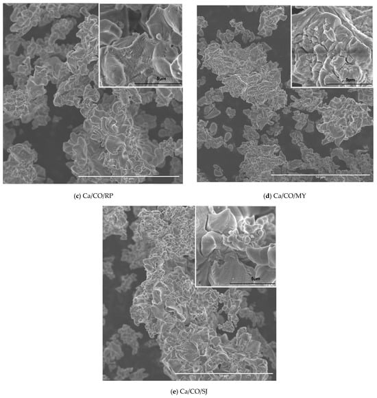 The morphological analysis further complements the understanding of functional behavior. Samples with high porosity, thin lamellar structures, and wrinkled or fractured surfaces (e.g., Ca/CO/RP and Ca/CO/CG) present increased surface area and accessibility to external reactants, favoring enhanced reactivity, particularly in catalytic or ion-exchange processes. In contrast, samples like Ca/CO/MY and Ca/CO/SJ, which exhibit more compact structures with smoother surfaces, are expected to be less reactive but mechanically more stable, making them suitable for structural or support materials in composites.