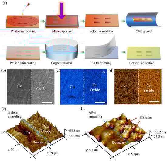 (a) Schematic diagram of the fabrication procedure for flexible patterned graphene devices; (b) SEM image of copper substrate after selective oxidation for 30 min, scale bar: 5 μm; (c,d) EDS mappings of copper and oxygen elements taken from (b), respectively; (e) 3D AFM image of selectively oxidized substrate before annealing; (f) 3D AFM image of selectively oxidized substrate after annealing, with red arrows indicating 3D holes.