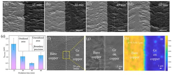 (a–d) SEM images of selectively oxidized copper substrates after oxidation for 15, 30, 45, and 60 min, respectively, scale bar: 10 μm; (e) histogram of variation in boundary precision via oxidation time; (f) SEM image of patterned graphene grown on copper oxidized for 45 min; (g) magnified SEM image of boundary in (f); (h) Raman 2D peak mapping of graphene corresponding to (g).
