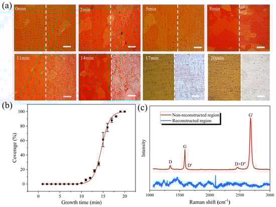 (a) Optical micrographs of patterned graphene growth with different growth times, scale bar: 50 μm; (b) fitting curve of graphene coverage varying with growth time in unoxidized region; (c) Raman spectra of patterned graphene transferred to SiO2 (D peak of ~1342 cm−1, G peak of ~1580 cm−1, D+D’’ peak of ~2460 cm−1, G’ peak of ~2700 cm−1).