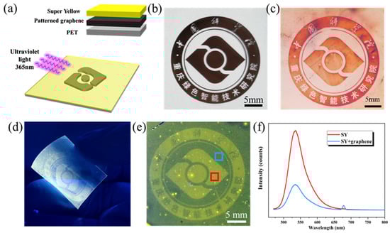 Super Yellow (SY), a widely used emissive layer in OLEDs due to its strong fluorescence [36,37], was employed to demonstrate the photoluminescence properties of flexible graphene electronics. As illustrated in Figure 4a, SY dissolved in toluene was spin-coated (800 rpm, 45 s) onto graphene-transferred PET substrates. The inset in Figure 4a depicts a cross-sectional schematic diagram of the device architecture, with the layered structure comprising SY, graphene, and the PET substrate sequentially arranged from top to bottom. The Chongqing Institute logo photolithography mask (Figure 4b) generated corresponding patterned graphene on copper (Figure 4c).