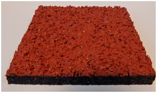 Figure 1) consisting of a base layer made of SBR (styrene–butadiene rubber) granules bound with polyurethane resin, topped with a fine-textured EPDM (ethylene propylene diene monomer) layer applied using a spray method. The top layer was formulated with colored EPDM granules (0.5–1.5 mm fraction) and aliphatic PU binder in a mass ratio of 1:0.2.
