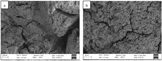 Figure 9a). These discontinuities often originated in weakened zones between granules or at binder-matrix interfaces and extended progressively under cyclic thermal and hygroscopic stress. In some areas, cracks exhibited widening and deepening, evolving into branched cracking patterns that suggest ongoing embrittlement and loss of cohesion within the surface layer. The crack propagation pathways indicate that the material experienced not only photochemical damage but also mechanical fatigue due to differential expansion and contraction during the aging cycle.