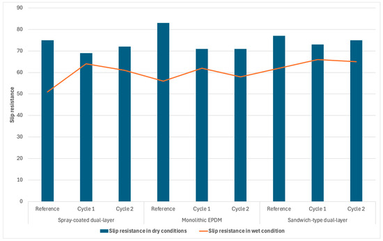 Following Cycle 1 (UV + condensation), a general decrease in slip resistance under dry conditions was observed across all surface types. The monolithic EPDM surface retained the highest dry slip resistance (