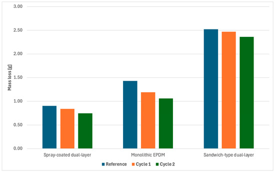 After undergoing Cycle 1: UV + condensation, all surfaces showed an increase in mass loss, indicating a reduction in abrasion resistance due to environmental degradation. However, the monolithic EPDM surface still maintained relatively low mass loss compared to the other systems, confirming its durability under aging. The spray-coated dual-layer system exhibited the greatest increase in mass loss, which can be attributed to the softening and surface degradation caused by the UV radiation and condensation cycles. The higher rate of material breakdown in this system is consistent with findings from Hong et al. [