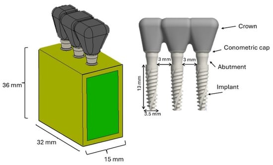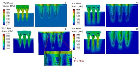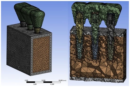 - Mahantesh, T.; Girish, H.C. Effect of implant diameter and length on stress distribution in peri-implant bone: A finite element study. Int. J. Oral Maxillofac. Implant. 2016, 31, e25–e31. [Google Scholar]