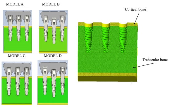 - Toniollo, M.B.; Macedo, A.P.; Silveira Rodrigues, R.C.; Ribeiro, R.F.; da Gloria Chiarello de Mattos, M. A Three-Dimensional Finite Element Analysis of the Stress Distribution Generated by Splinted and Nonsplinted Prostheses in the Rehabilitation of Various Bony Ridges with Regular or Short Morse Taper Implants. Int. J. Oral Maxillofac. Implant. 2017, 32, 372. [Google Scholar] [CrossRef]