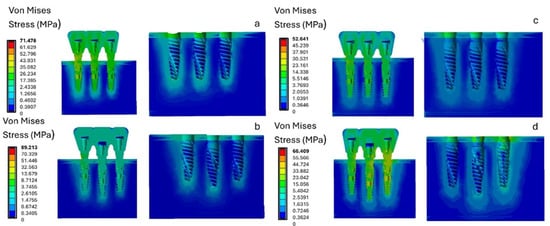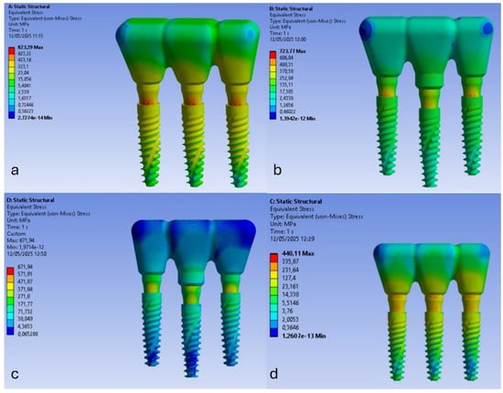 - Toniollo, M.B.; dos Reis, K.E.M.; Sakamoto, S.P.d.S.; Terada, A.S.S.D.; Paranhos, L.R.; Macedo, A.P.; da Silva, R.C.D.; Limirio, P.H.J.O. Von Mises equivalent stresses developed in fixed partial denture infrastructures on implants according to changes in their prosthetic materials. J. Oral Implantol. 2025, 51, 267–274. [Google Scholar] [CrossRef] [PubMed]