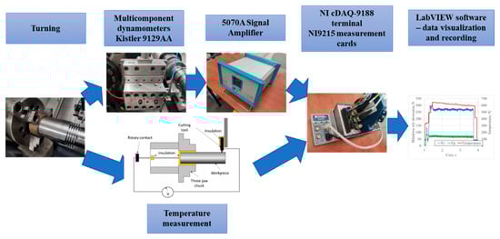 The experiments were conducted on a multifunctional 3-axis CNC lathe (Okuma Genos L200E-M), equipped with a measurement setup capable of recording the Cartesian components of cutting forces. The cutting forces were measured using a piezoelectric dynamometer (Kistler model 9129AA), while the temperature in the cutting zone was measured using the natural thermocouple method. The calibration of the measurement system and the related accuracy have been described in detail in [21]. A schematic of the measurement setup is shown in Figure 1.